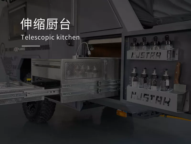 “Explorer” off-road trailer is a product independently developed by South Pole Star RV Equipment Co., LTD., with complete intellectual property rights, the body uses aviation aluminum material, with expansion function, can live three to five people. The chassis adopts independent suspension, suitable for a variety of road conditions, and the car is equipped with toilet, water heater, refrigerator and other facilities, optional air conditioning, solar energy, fuel heating and other equipment, so that your travel is more comfortable. The car design size is reasonable, can enter the underground garage parking, no restrictions such as high limit width, can take you further to see different scenery.